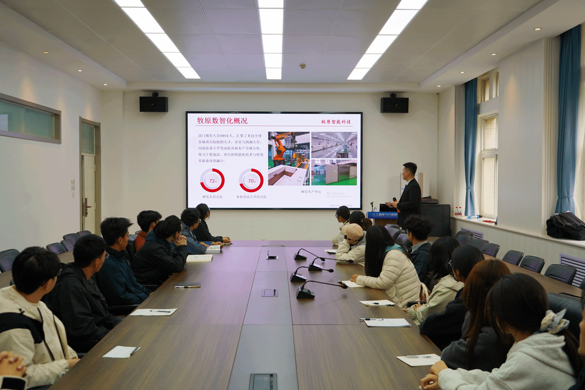 在培训中,王柳淞从宏观框架入手,系统解析了产业数智化的整体图景,并介绍了牧原集团的战略布局与数字化转型的价值闭环。针对于技术实战,对无针注射、智能巡检、咳嗽识别及养猪大模型等核心装备,从技术架构与场景适配维度进行了深度剖析,进而延伸到学以致用环节,通过真实案例生动阐释了数学建模、机器学习等理论知识在产业中的转化路径,明确了知识应用的实践边界,在最后的互动交流中,现场学生踊跃提问,他结合行业人才需求画像与学生个人情况,就学业规划、技能储备与职业发展路径等问题给予了细致解答,提供了极具针对性的指导。