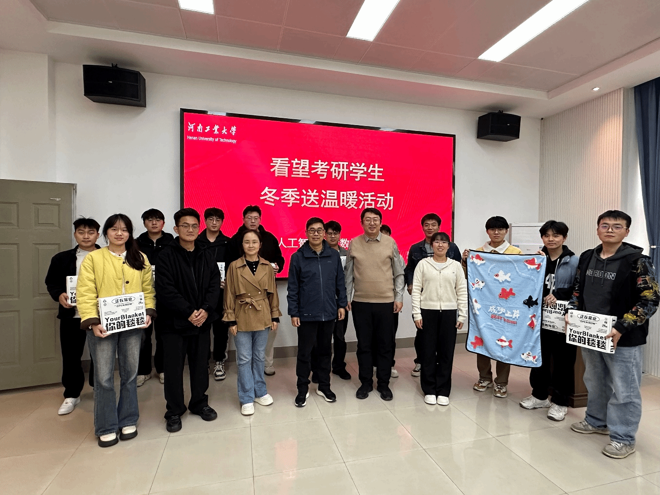 随后,学院为学生代表们发放毛毯,将承载着学院牵挂与寄托着“逢考必过”、“必定上岸”、稳“赢”的暖冬礼物分发给学生。学生们纷纷表示会坚持到底,赢在未来。此外,暖冬礼物也陆续发放至其他考研同学手中。
