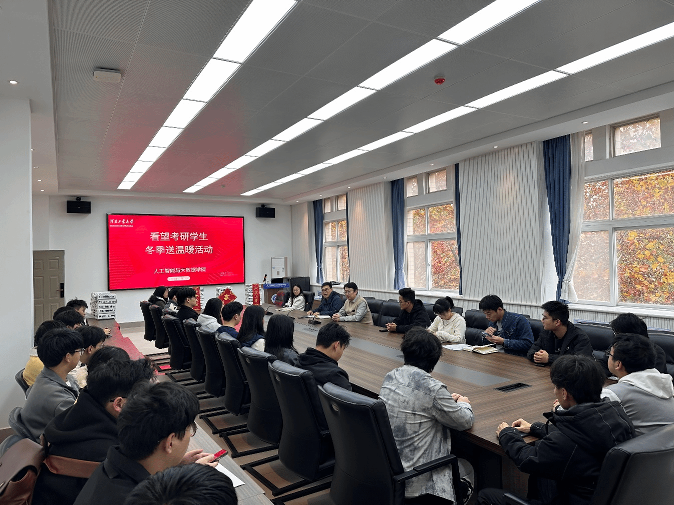 在惟学楼6369会议室,开展了2025年看望考研学生冬季送温暖活动,学院党委书记杜鹏、党委副书记赵志洋、辅导员及学生代表参与了本次活动,会议由赵志洋主持。
