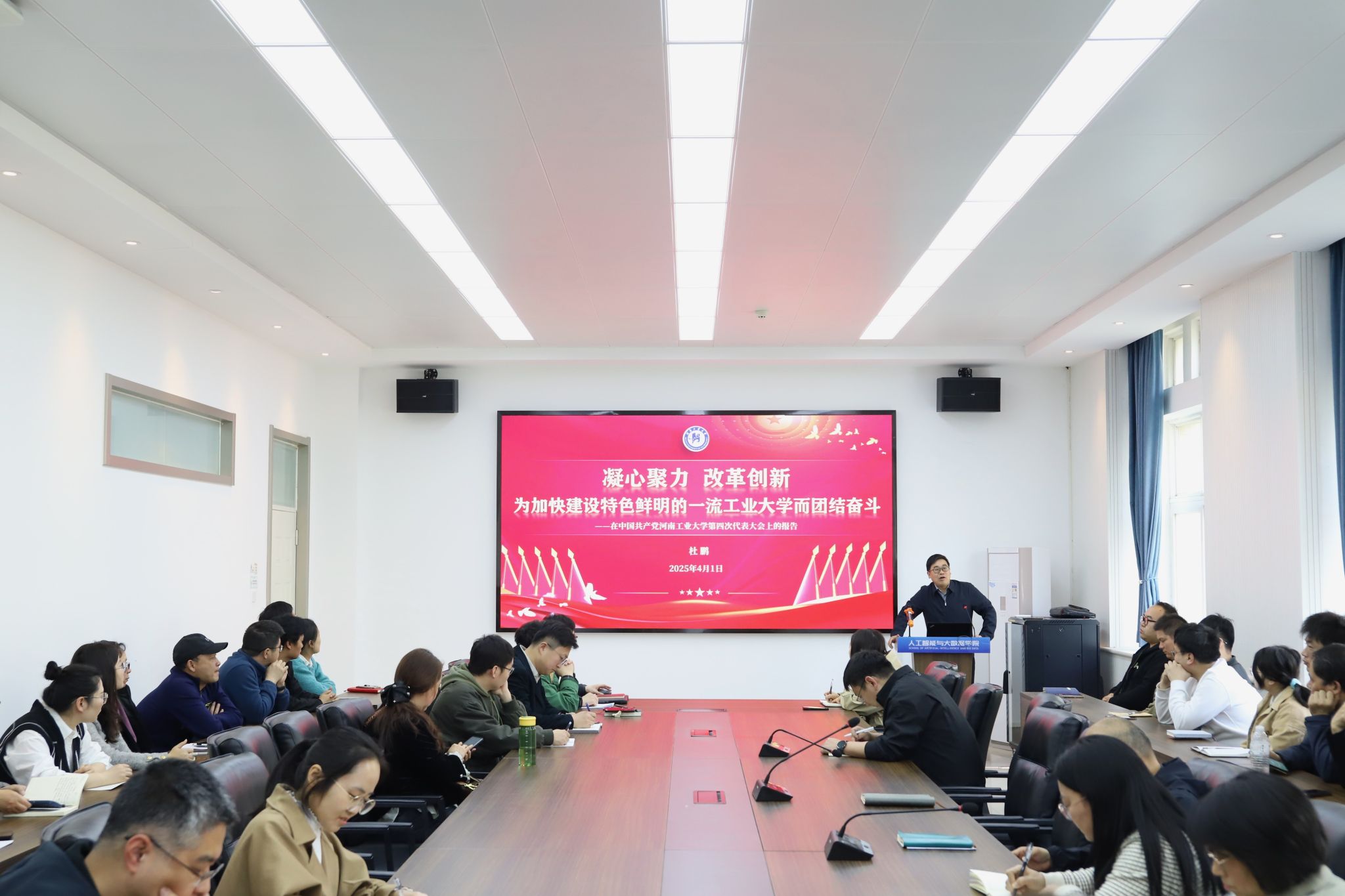 第四次代表大会精神,学院班子成员及全体教职工参加会议。