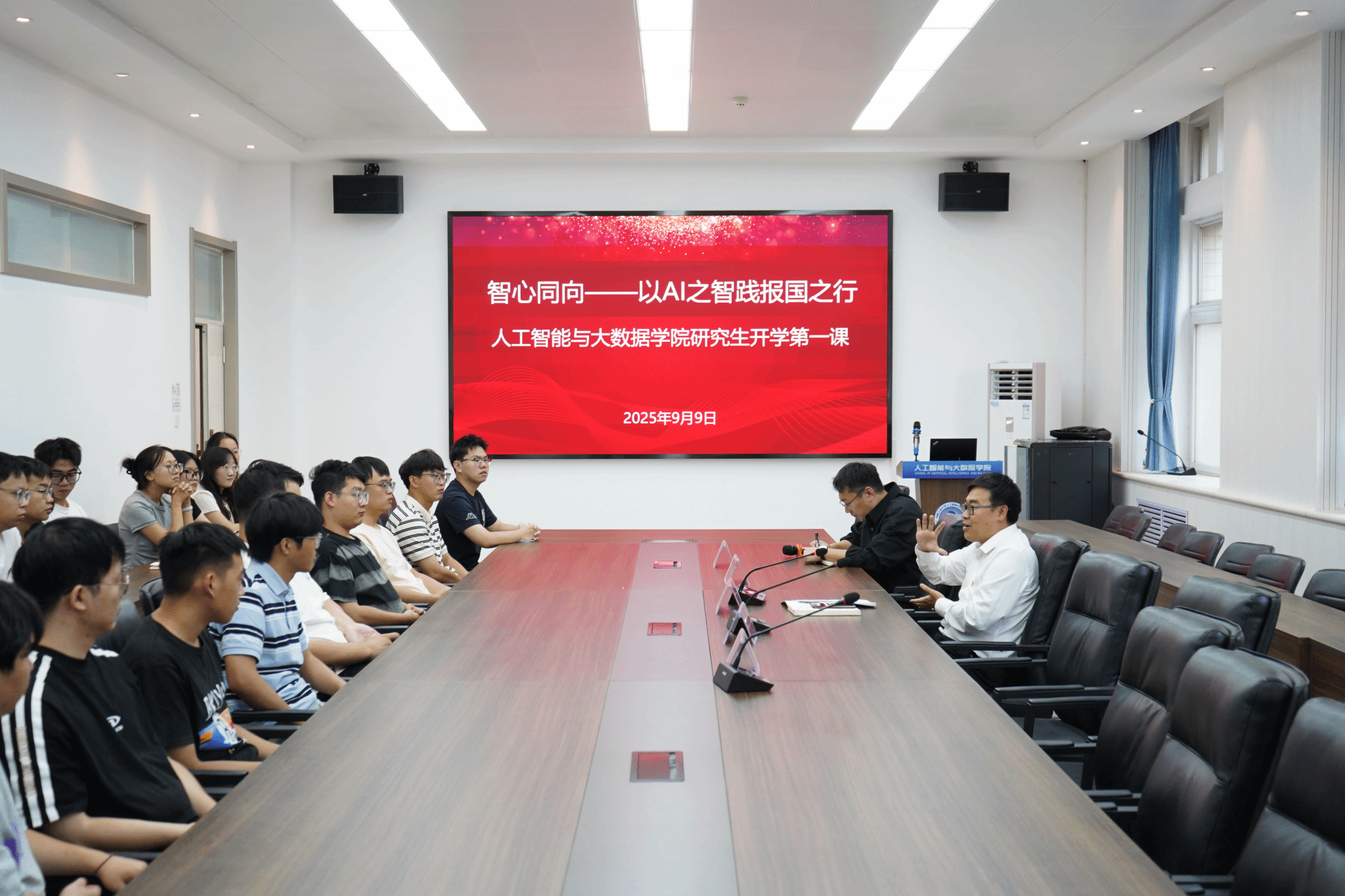 典礼结束后学院党委书记杜鹏以“智心同向:以AI之智践报国之行”为题为2025级全体研究生集中讲授“开学第一课”。他带领同学们回顾了学校的办学历史,在学校即将迎来70周年校庆之际,他鼓励同学们在求学之路上,勇担时代使命,做有理想、有担当、能吃苦、肯奋斗的时代青年。
