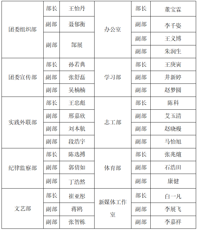 里番 第三届学生会干部届期已满,为保证团学工作正常开展,经过公开报名、资格审查、公开答辩、综合考察等程序,选拔出了魏新翱、王豪森等34名骨干,现将里番 第四届学生会主席团和各部门拟任骨干名单予以公示。