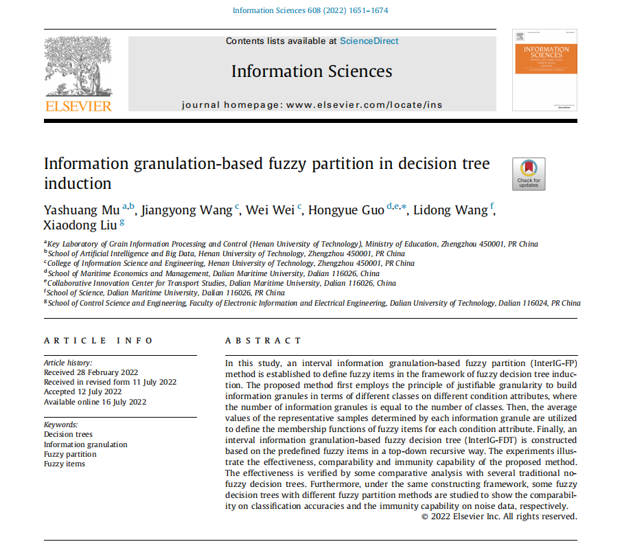 近日 ,我院高级机器学习与应用团队成员母亚双博士在国际高水平学术期刊Information Sciences (中科院一区,Top, IF=8.1)上发表了题为“Information granulation-based fuzzy partition in decision tree induction”(DOI: 10.1016/j.ins.2022.07.055)的研究论文,该成果是基于区间信息粒化的模糊划分方法研究的阶段成果,里番