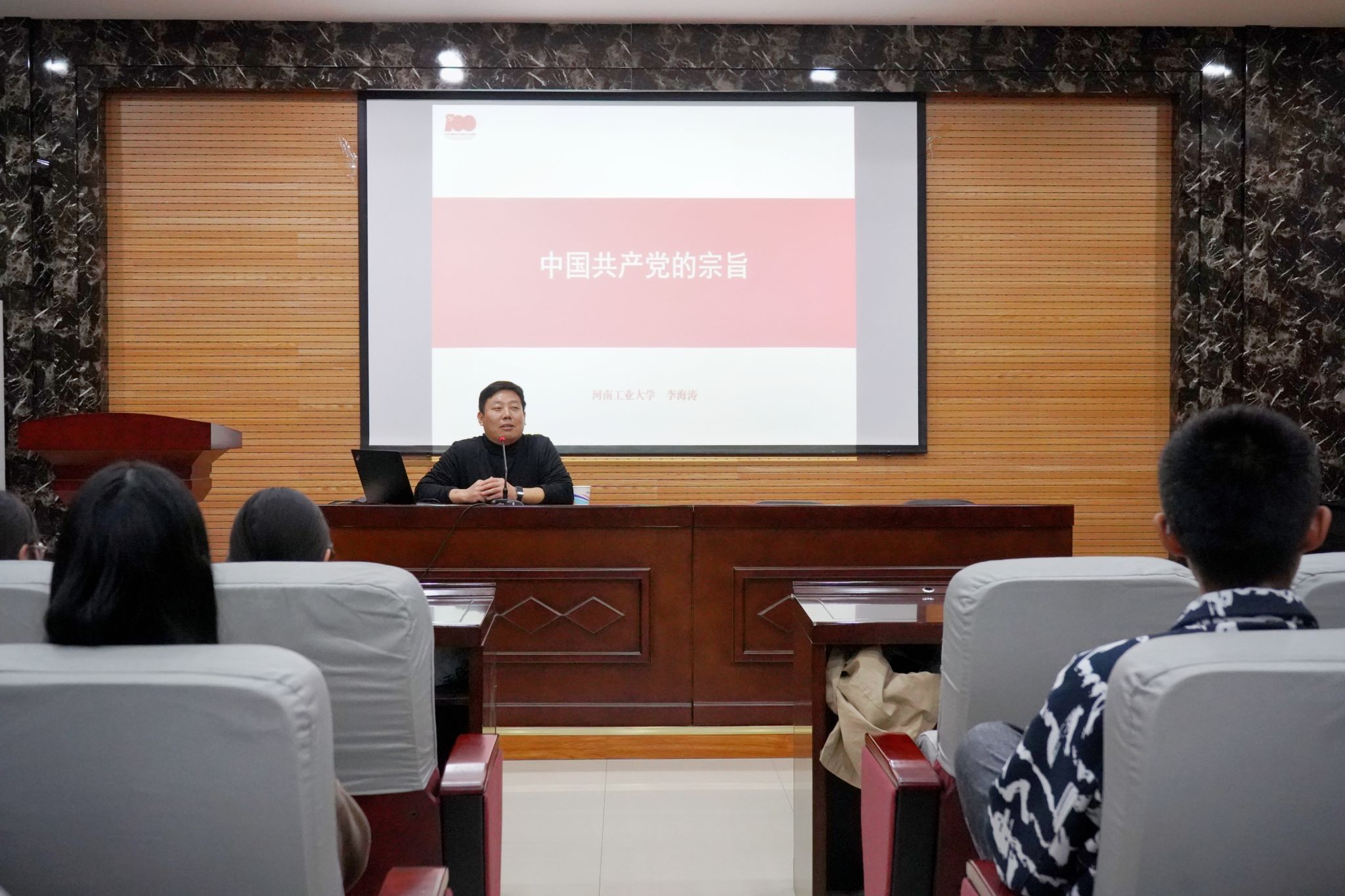 开班仪式结束后,李海涛教授以《中国共产党的宗旨》为主题进行了专题授课。他从三个维度深入浅出的讲述了中国共产党的宗旨——全心全意为人民服务,并举例分析了中国共产党成功的历史原因和政策方略,阐述了践行党的宗旨的深刻意义,并鼓励学员通过学习不断提高自身政治素质和理论水平,以实际行动践行党的宗旨。