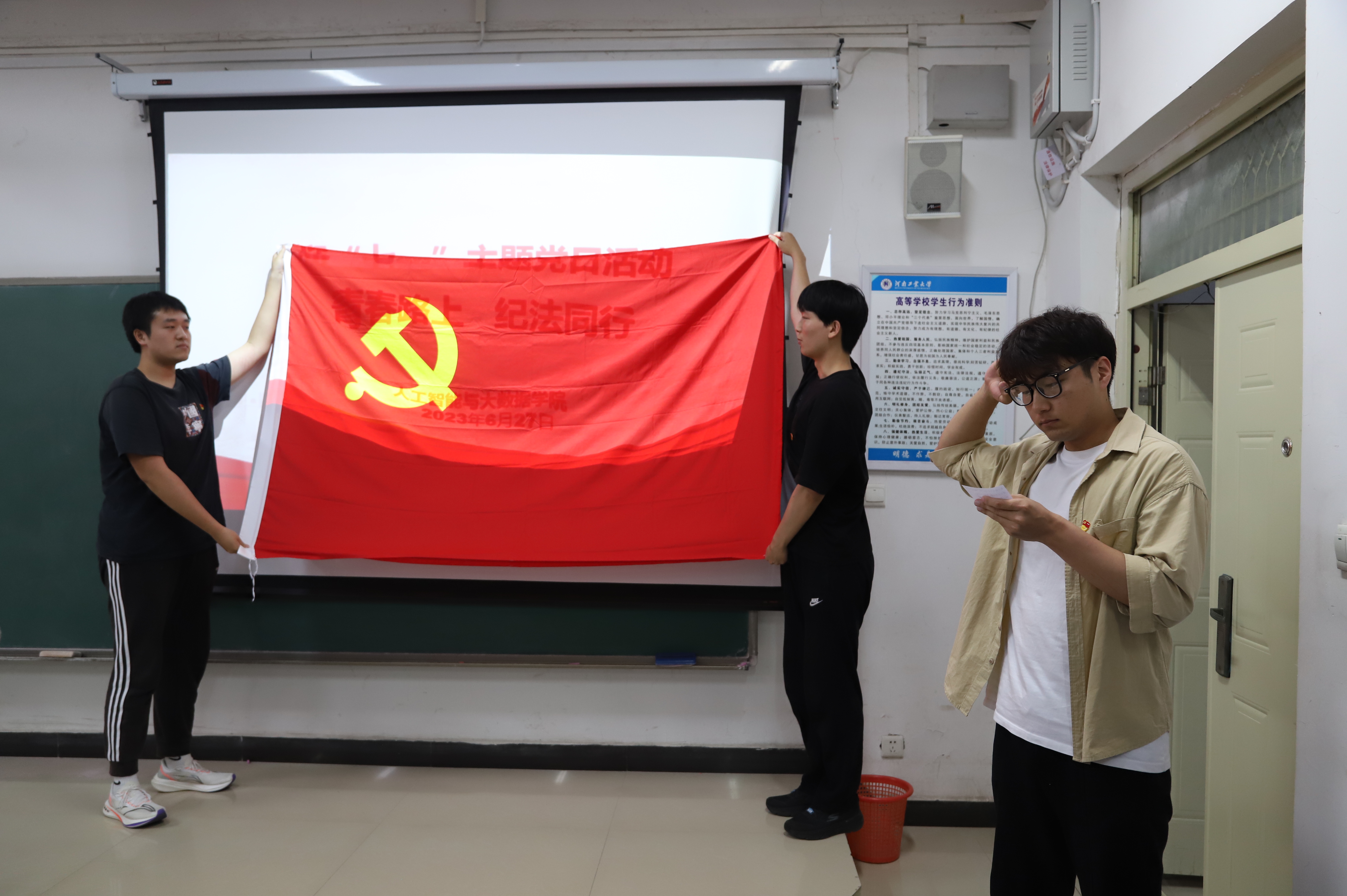 于6月27日在3105教室开展“青春路上,纪法同行”主题党日活动暨新党员入党宣誓和党员重温入党誓词仪式。学院党委书记杜鹏、党委副书记薛运侠、全体辅导员及学生党员参加此次会议。团委副书记郑帅主持会议。